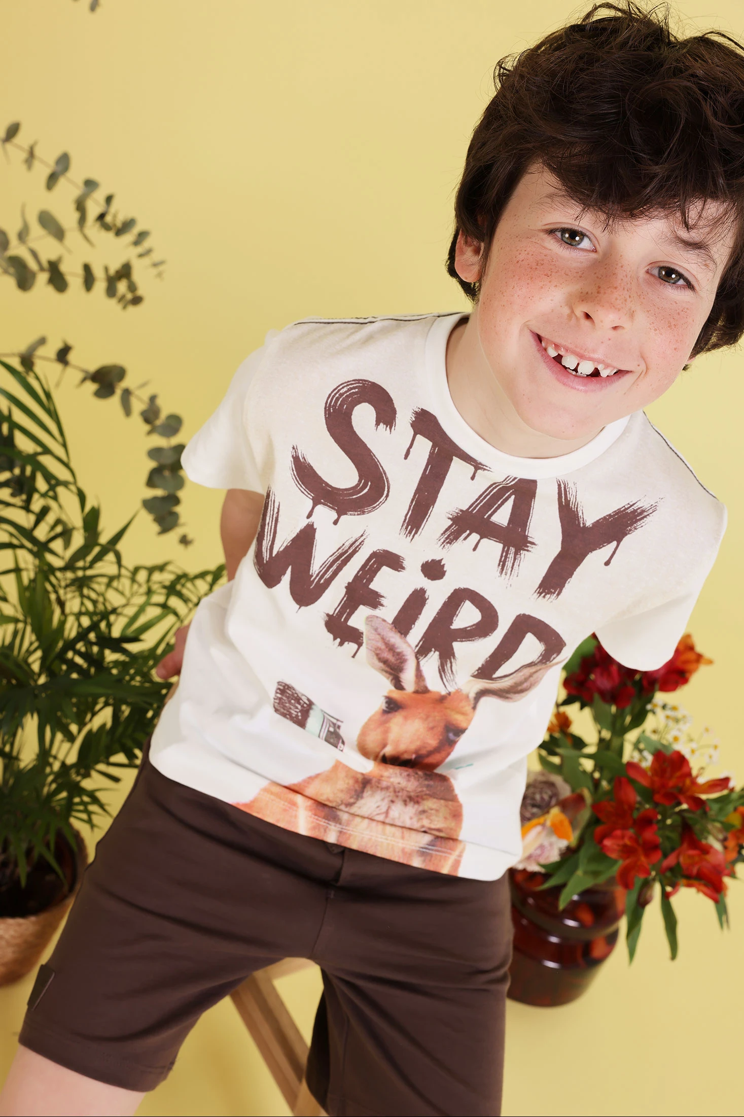 Green cotton set for boys, ideal for daily wear, featuring a T-shirt decorated with a large letter print and a kangaroo that adds a fun touch to the design. The shorts are brown. The material is soft and breathable, perfect for maintaining comfort in any situation. Sizes available from 12 months to 10 years. Its casual style and vibrant colour make it a fresh and modern look, ideal for any season of the year.