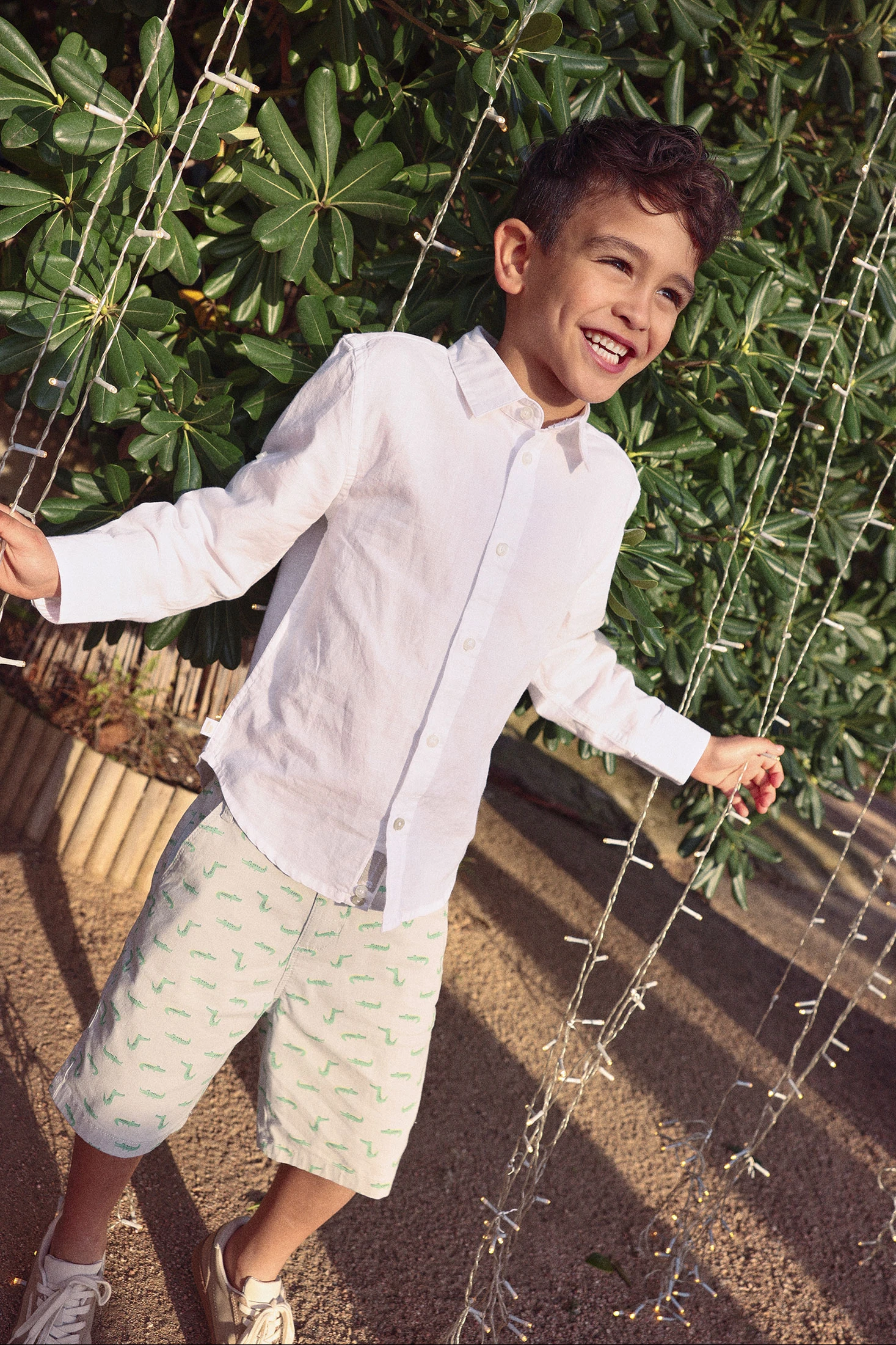 Printed cotton shorts offer comfort and freshness for the little ones. They feature a fun design with small animals in green tones on a light background, adding a playful touch. The soft cotton material ensures freedom of movement and is ideal for daily wear. Available in sizes from 12 months to 10 years. Their casual style makes them perfect to pair with T-shirts or polos, providing a relaxed and cheerful look for spring and summer days.