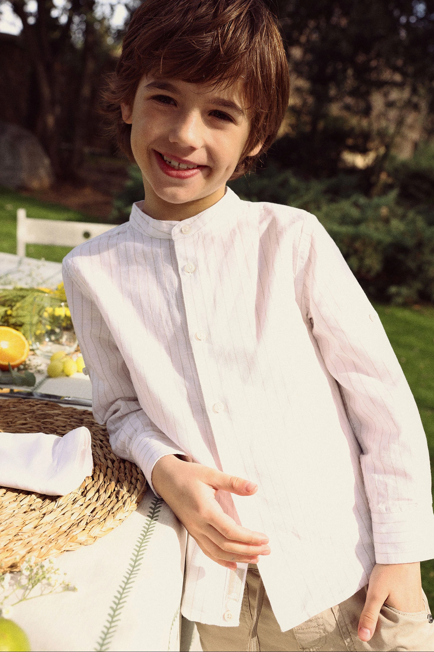 Striped linen shirt for boys, perfect for elegant occasions throughout the year. Featuring a classic design of vertical stripes in a soft beige colour, it offers a fresh and sophisticated look. It has a mandarin collar and buttoned front, ideal for pairing with casual or formal trousers. Available in sizes from 12 months to 14 years, this garment is versatile and comfortable. Its linen fabric ensures breathability and comfort, making it an ideal choice for any special event.