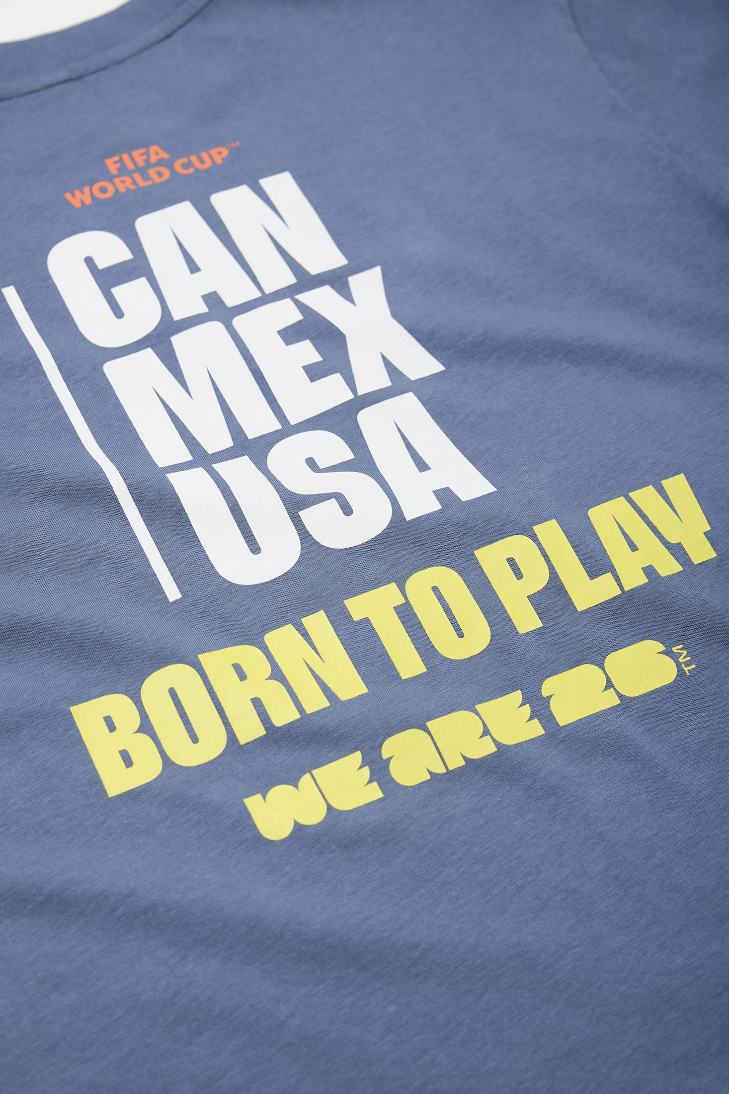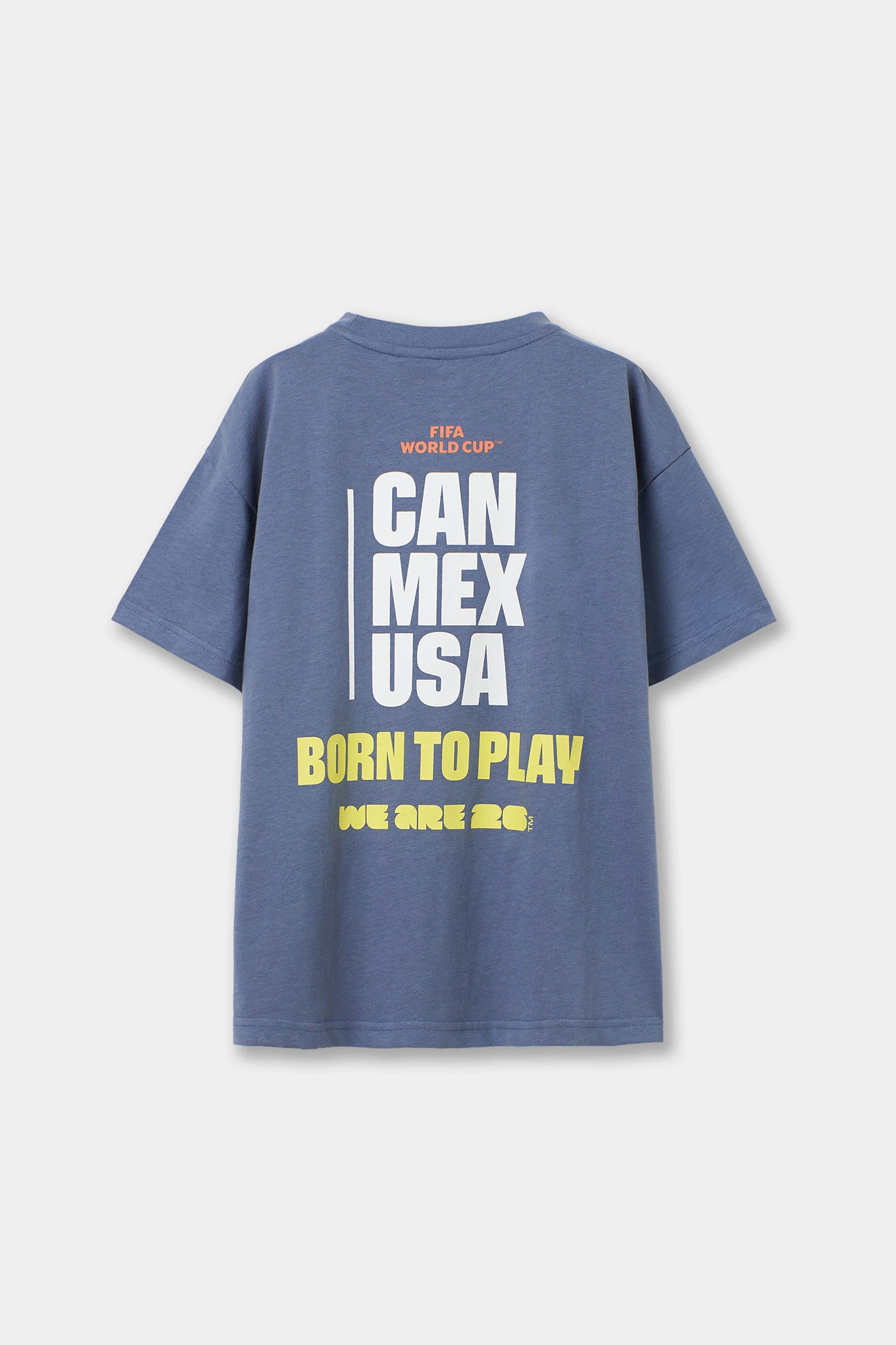 With a design inspired by the FIFA WORLD CUP 2026©, this boy's t-shirt in blue stands out for its large-format back print with the texts "CAN MEX USA", "Born to Play" and "We Are 26" in white and yellow. On the chest, a small FIFA World Cup logo completes the look. Round neckline and short sleeves for added comfort. Available in sizes from 4 to 14 years.