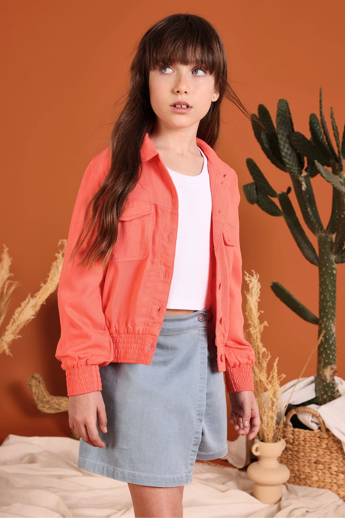 Viscose twill jacket for girls, perfect for the cooler days of spring or summer, crafted in a soft fabric that ensures comfort and warmth. Its strawberry colour design makes it versatile and easy to mix with different styles. Featuring a button closure and functional pockets, it offers practicality and style. Available in sizes from 2 to 14 years, it suits various ages and growth stages. Ideal for completing a casual or elegant look, keeping your girl warm and stylish.