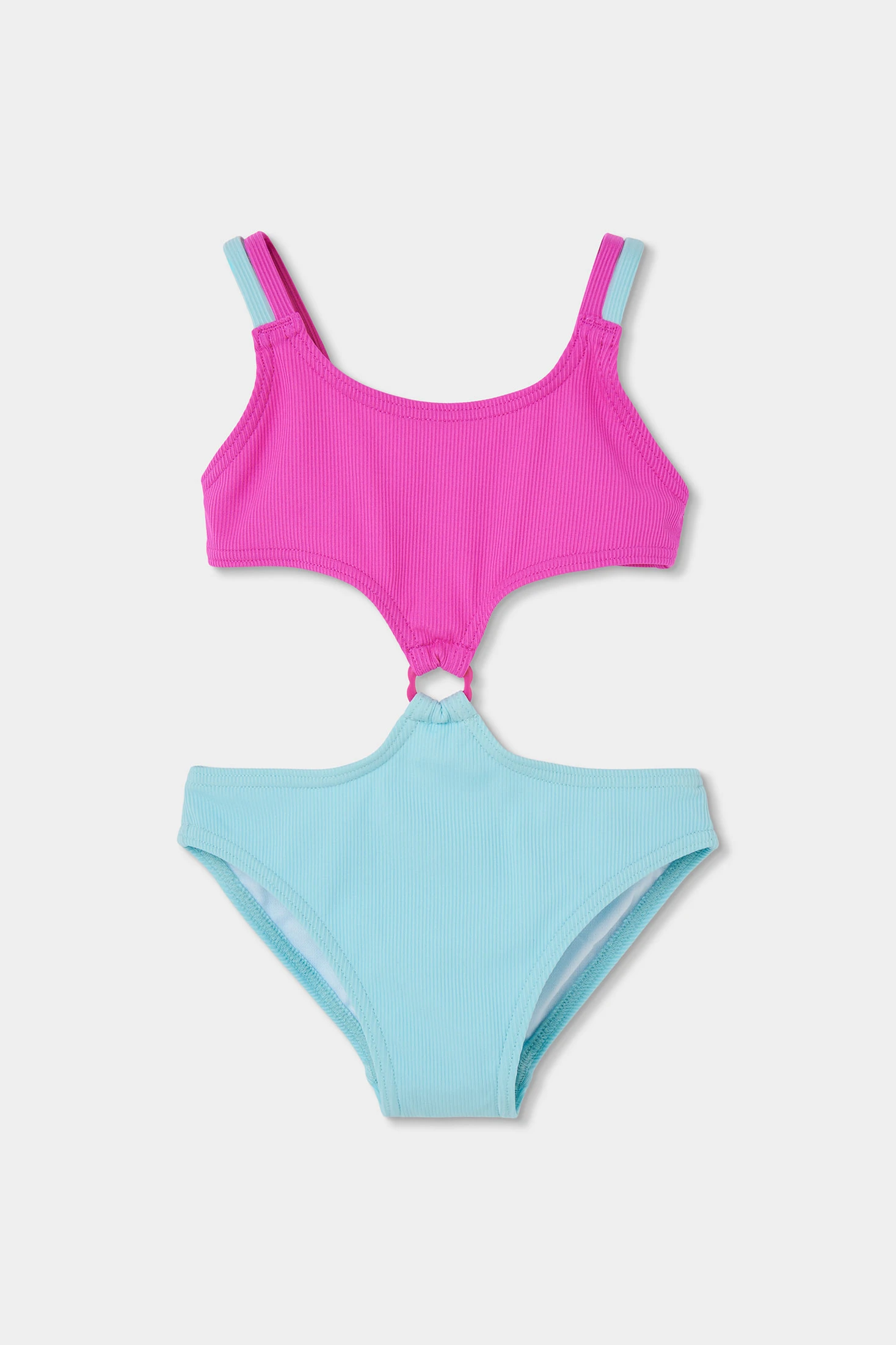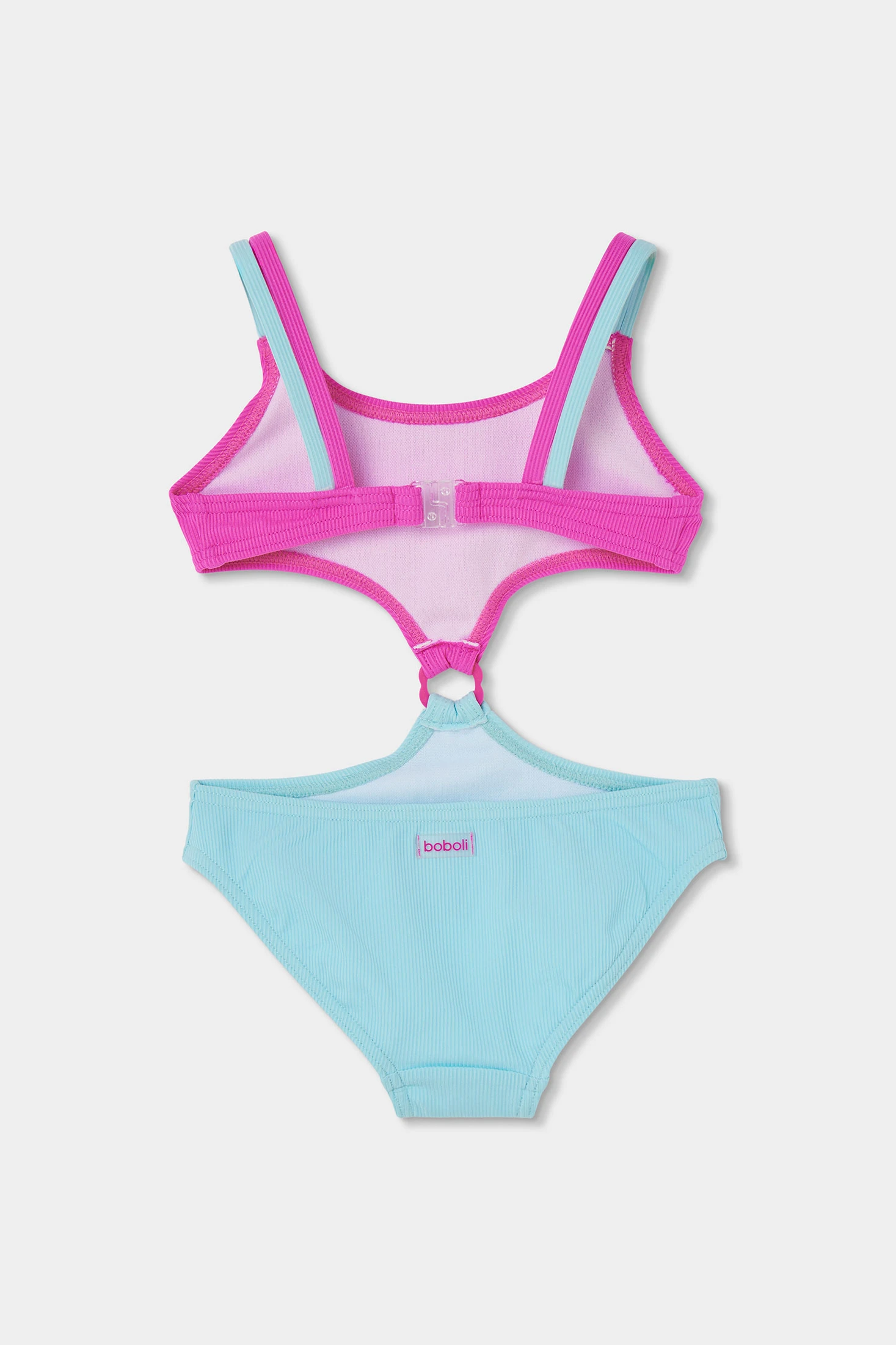 Girl?s color-block trikini ? a modern, vibrant piece perfect for summer. Made of soft fabric with UPF50 sun protection, ensuring comfort and freedom of movement. Its elastic material provides great comfort and a perfect fit. With crossed strap details, this trikini combines style and functionality for pool or beach fun. Available in sizes from 2 to 14 years.