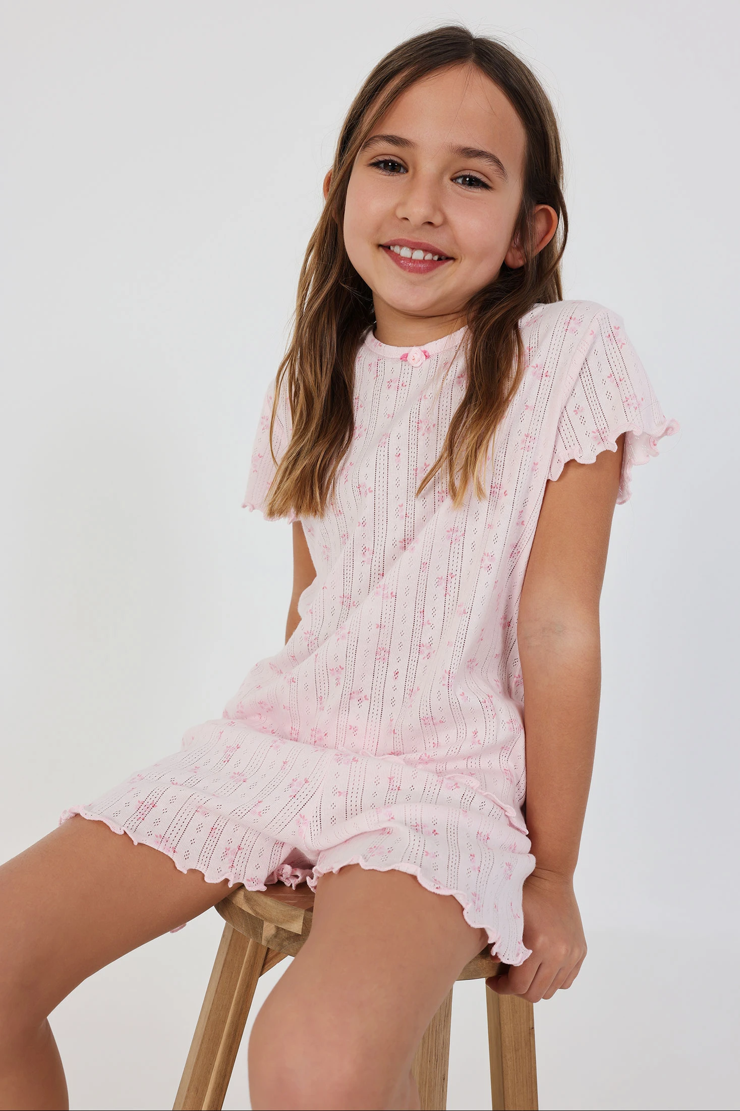 Girl?s pyjamas ideal for spring and summer, crafted in knit fabric offering softness and comfort. In light pink, it features a delicate floral print that adds a charming touch. With a round neck and short sleeves with wavy details, it?s perfect for staying cool throughout the night. Available in sizes for ages 2 to 12 years. Practical and comfortable pyjama set for your little one?s rest.