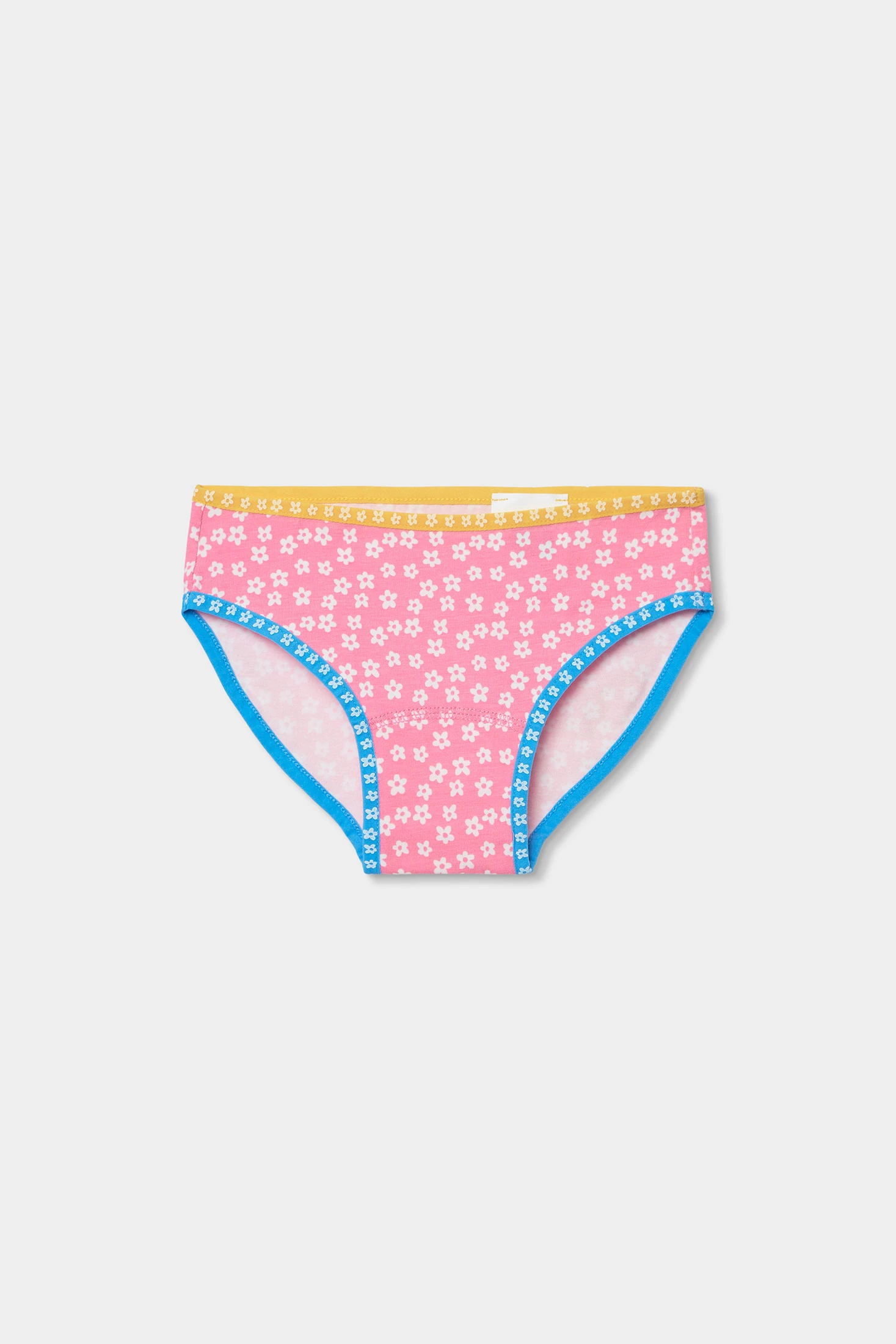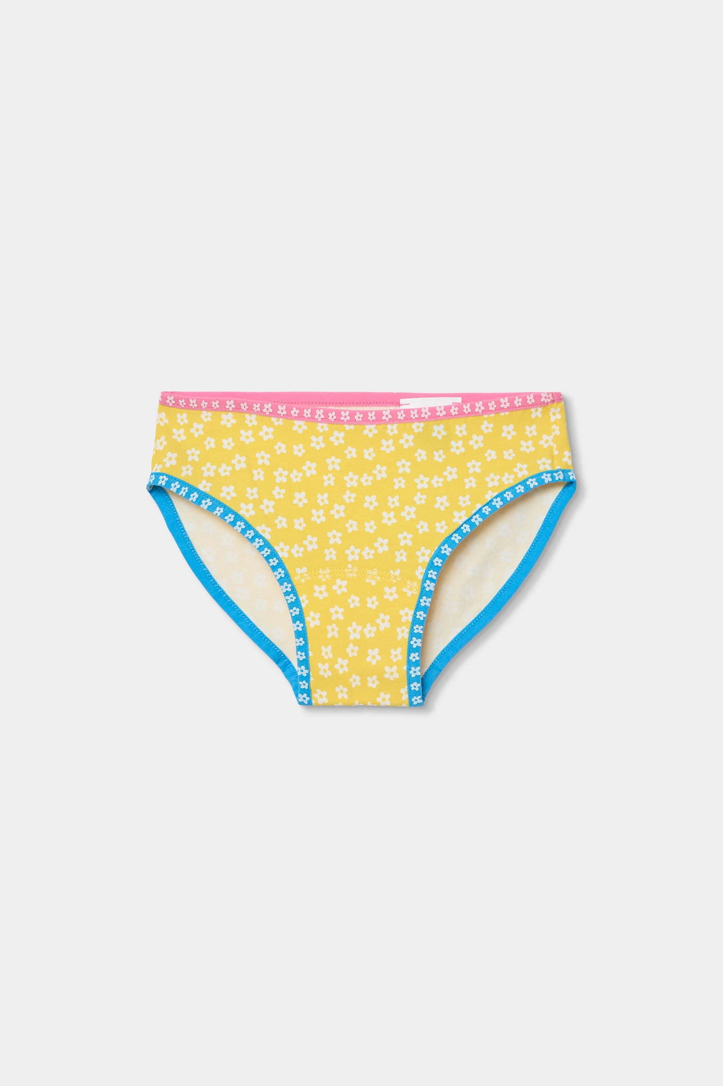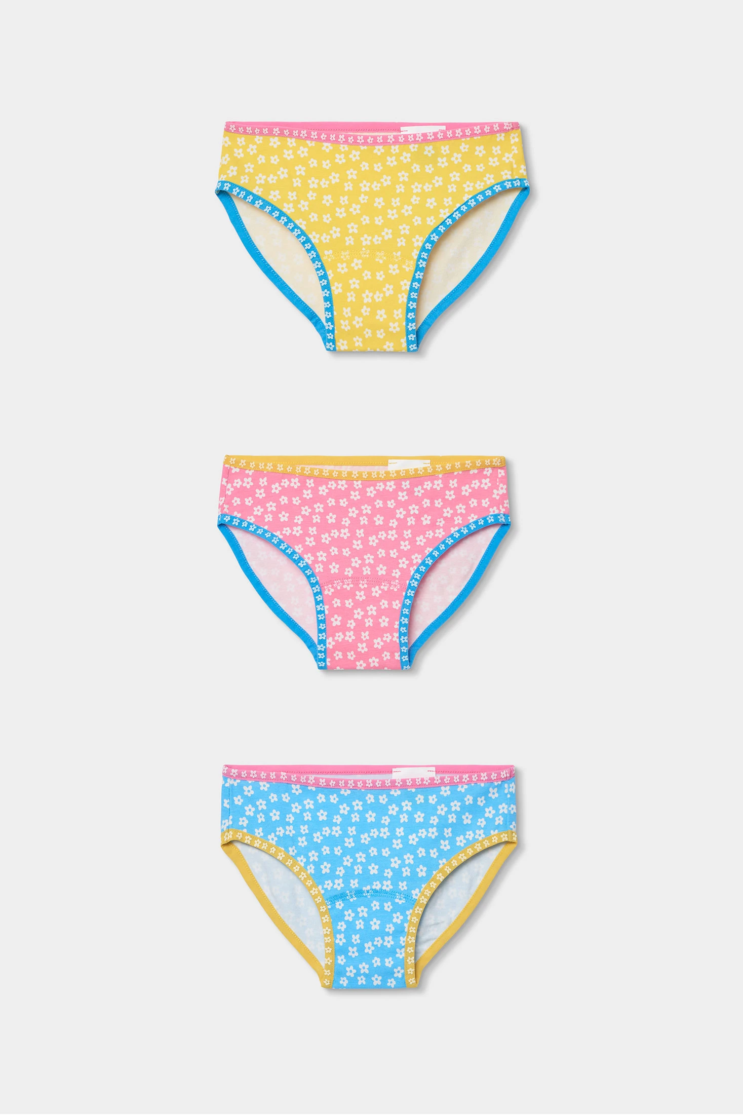 Pack of 3 printed knickers for girls made from soft cotton, ensuring comfort and freshness. Each pair of knickers features a floral design in cheerful colours: yellow, pink, and blue. Perfect for daily wear, they are ideal for girls aged 2 to 14 years. The knickers have elastic seams at the waist and legs, ensuring a comfortable and secure fit. Each design adds a fun touch to the wardrobe, allowing versatile combinations with different styles of clothing. A practical and colourful option for the little ones.