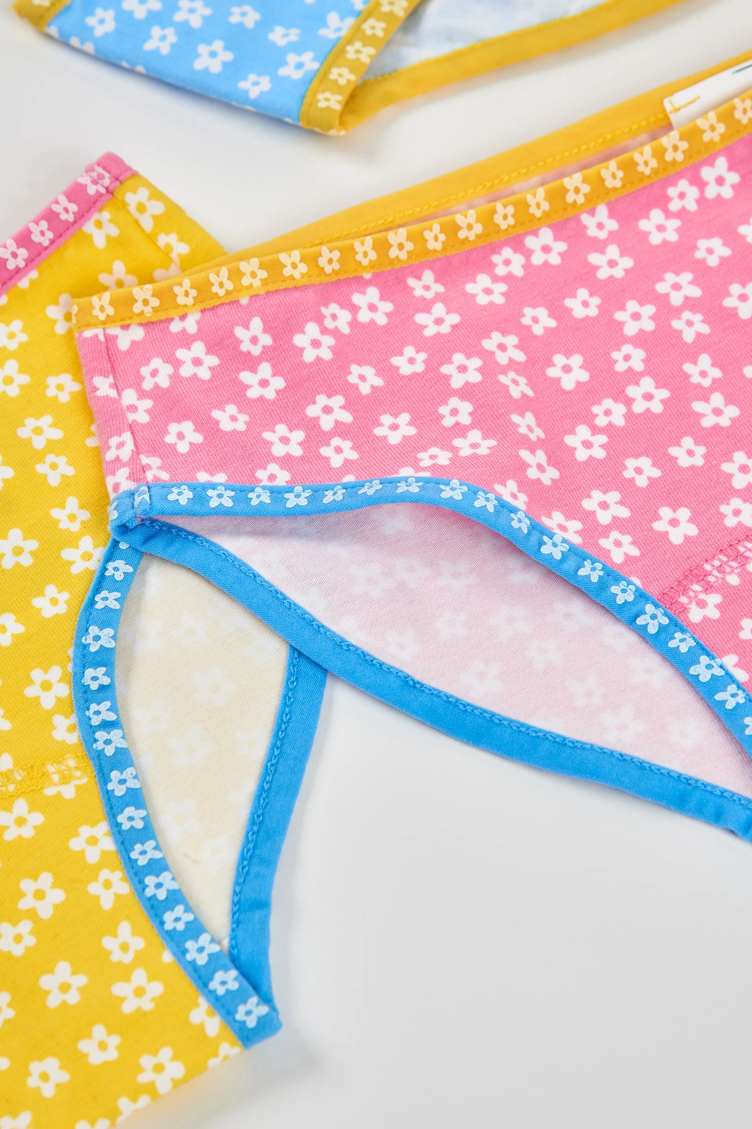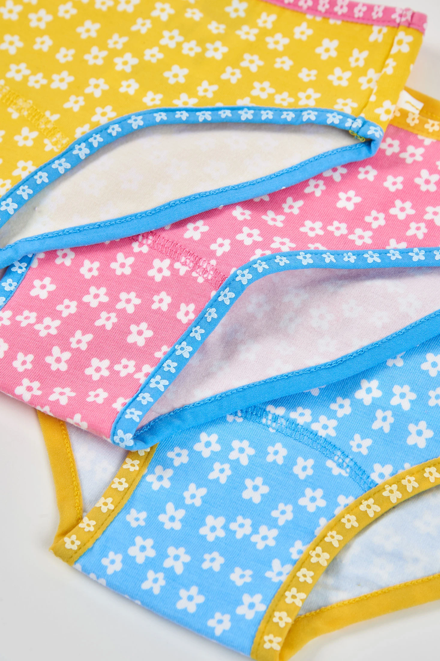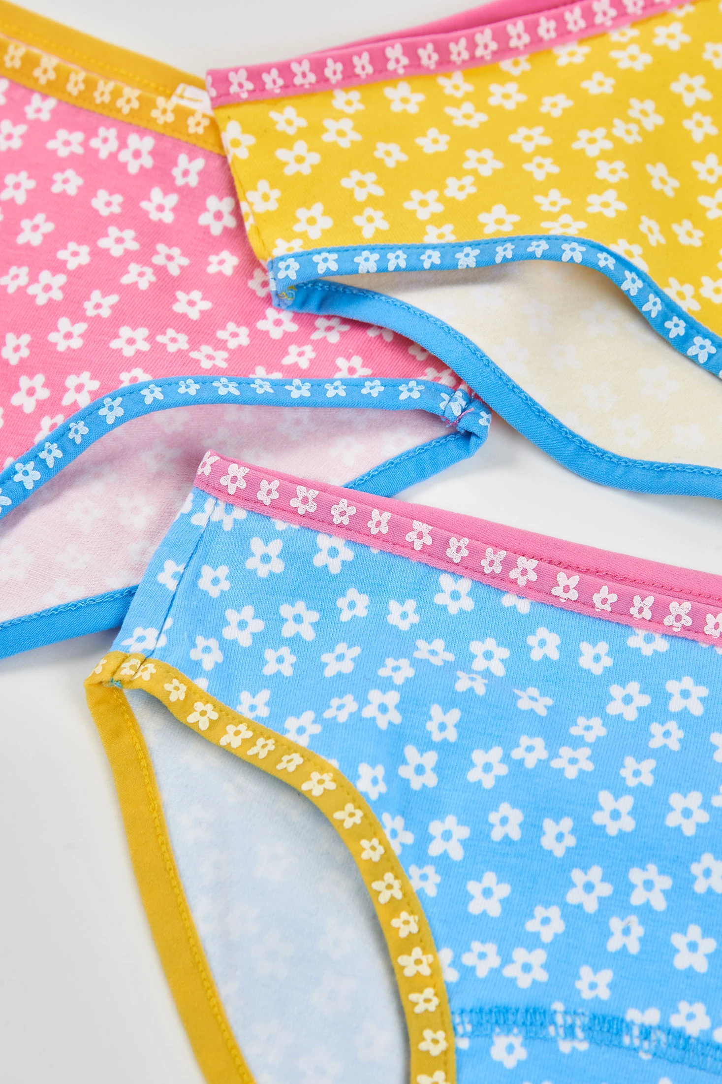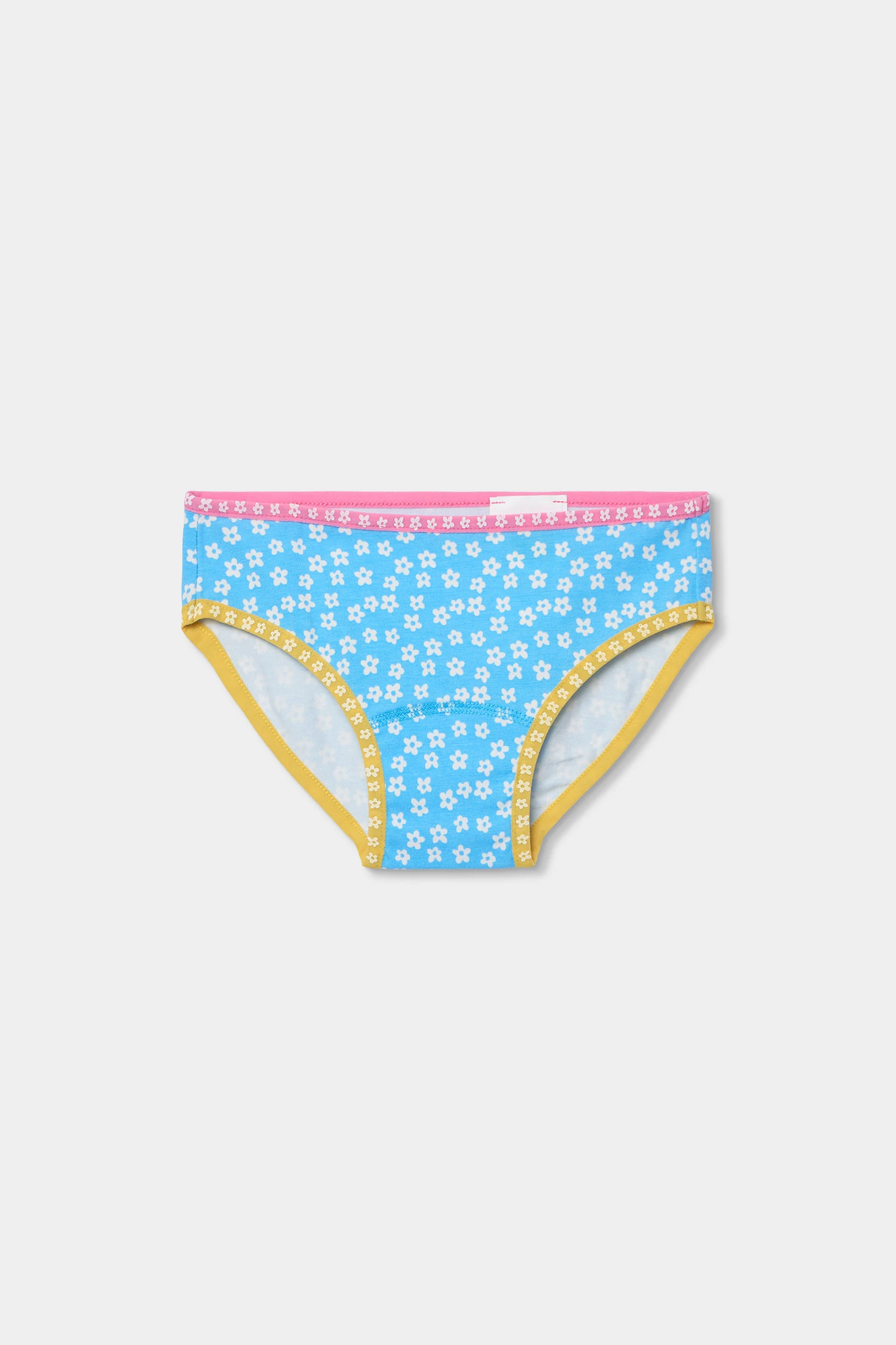 Pack of 3 printed knickers for girls made from soft cotton, ensuring comfort and freshness. Each pair of knickers features a floral design in cheerful colours: yellow, pink, and blue. Perfect for daily wear, they are ideal for girls aged 2 to 14 years. The knickers have elastic seams at the waist and legs, ensuring a comfortable and secure fit. Each design adds a fun touch to the wardrobe, allowing versatile combinations with different styles of clothing. A practical and colourful option for the little ones.
