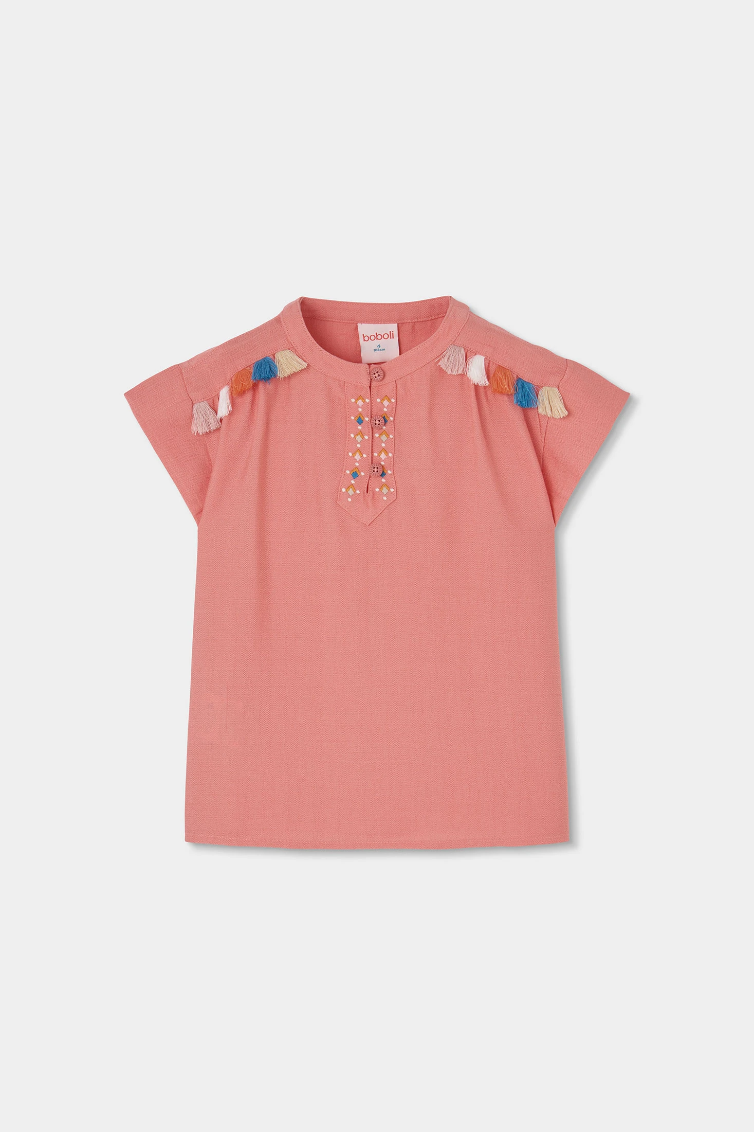 Fantasy fabric shirt in pink for girls, ideal for a vibrant and chic look. Features colourful tassel details on the shoulders and decorative embroidery on the front. The fabric with viscose ensures comfort and softness. Sizes range from 12 months to 12 years. Perfect for pairing with skirts or trousers, it is a versatile option for any occasion. Its cheerful and modern design adds a touch of style to any outfit.