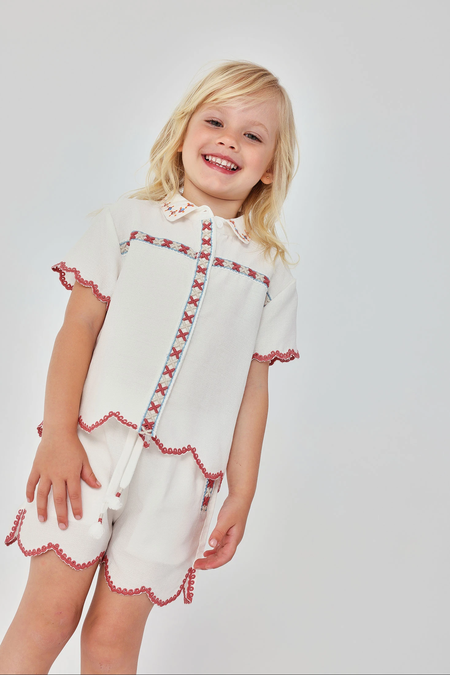 White fantasy fabric Bermuda shorts, ideal for summer days, offering comfort and freshness. They feature coloured embroidered details on the sides and a scalloped hem, adding a fun and colourful touch. Their functional design includes an elastic waistband with a drawstring, fitting well for children aged 12 months to 10 years. They are perfect for pairing with light t-shirts or blouses, creating a fresh and summery look, ideal for outdoor activities and playtime.
