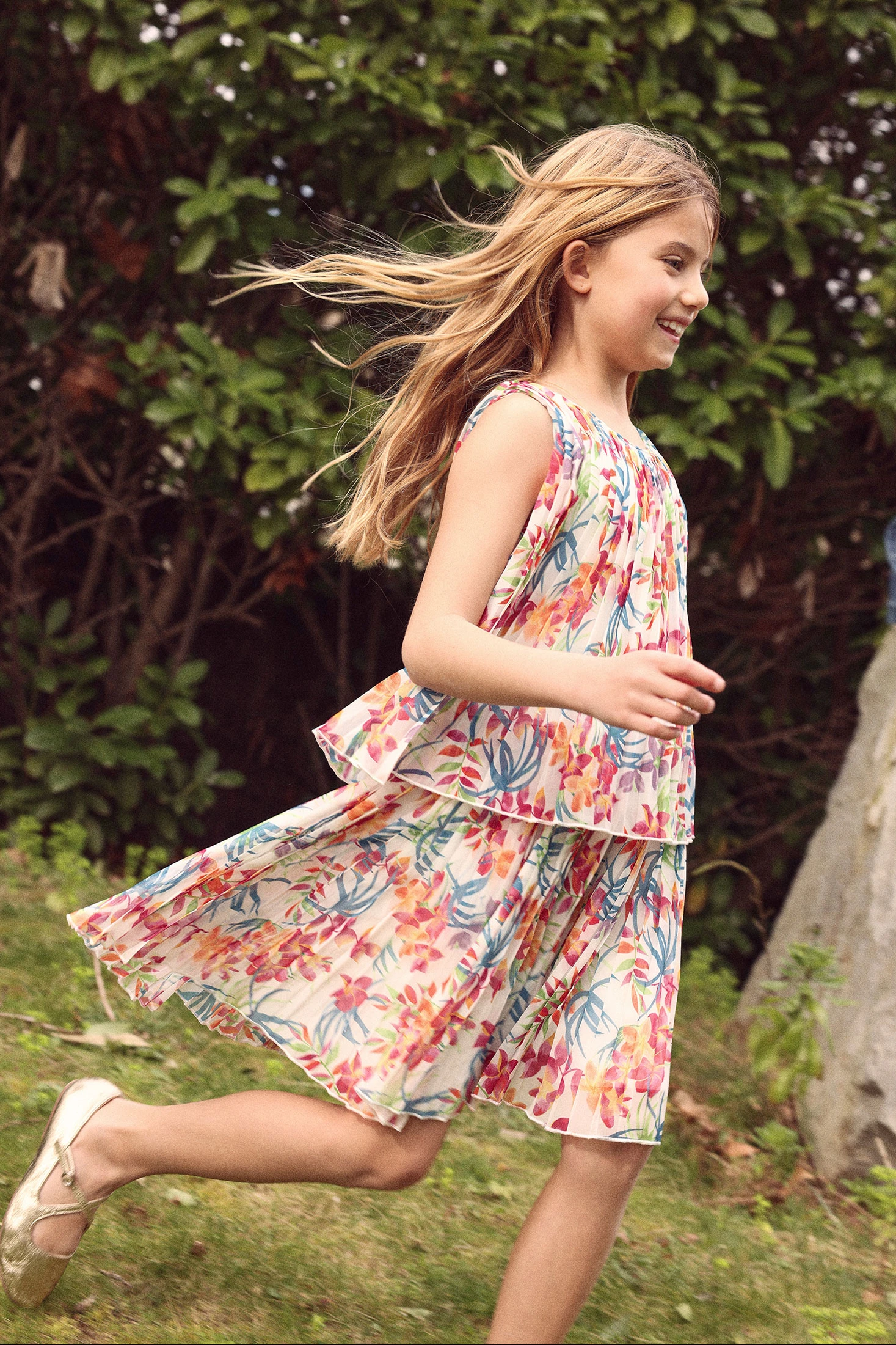 Printed pleated chiffon dress ideal for girls, available in sizes from 2 years up to 14 years. Featuring a cheerful design of flowers and leaves in vibrant shades such as red, blue, and green, this sleeveless dress is intended for special occasions. The light chiffon provides a fluid and elegant movement. Its colourful print makes it perfect for pairing with neutral or colourful accessories, adding a touch of freshness and charm to any event.