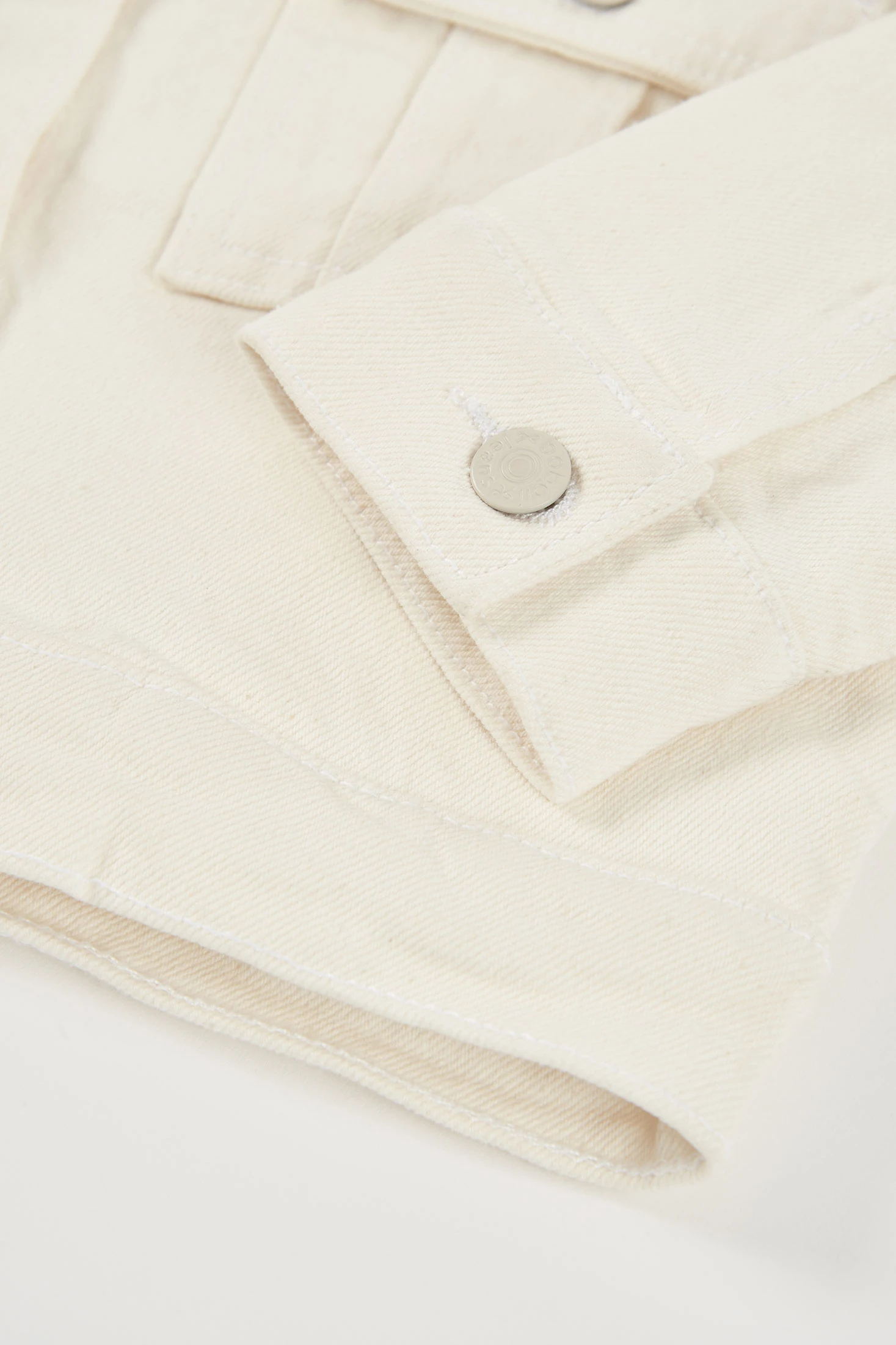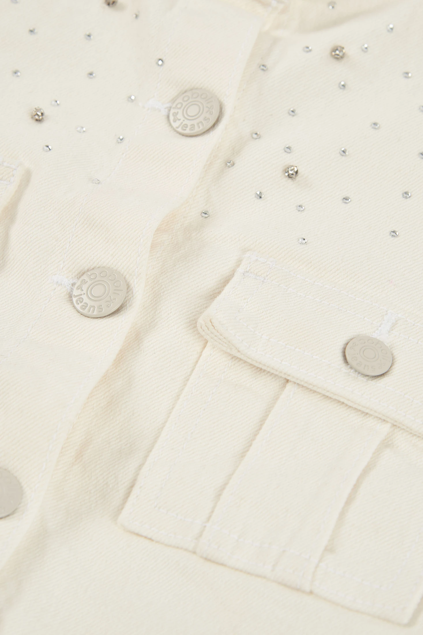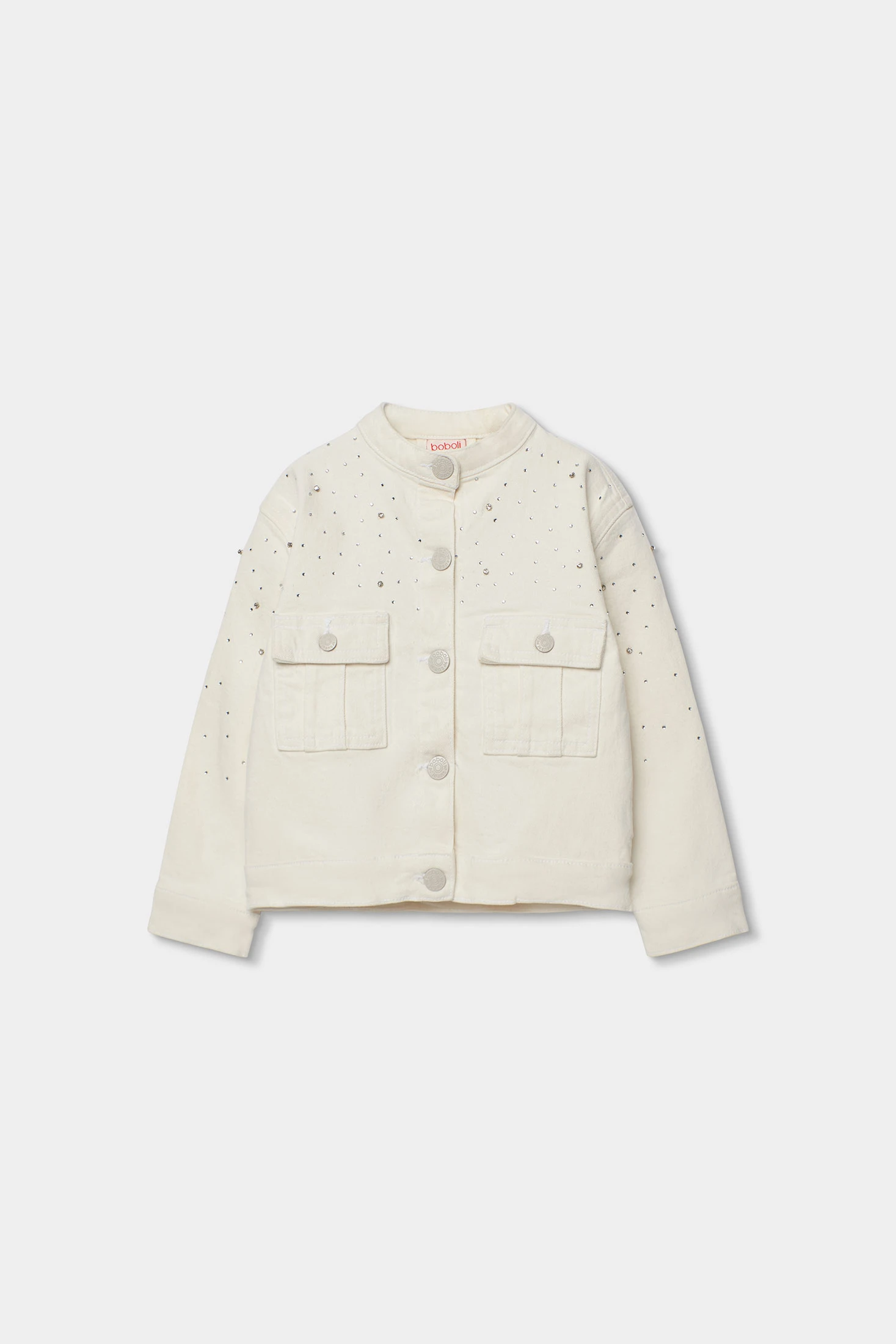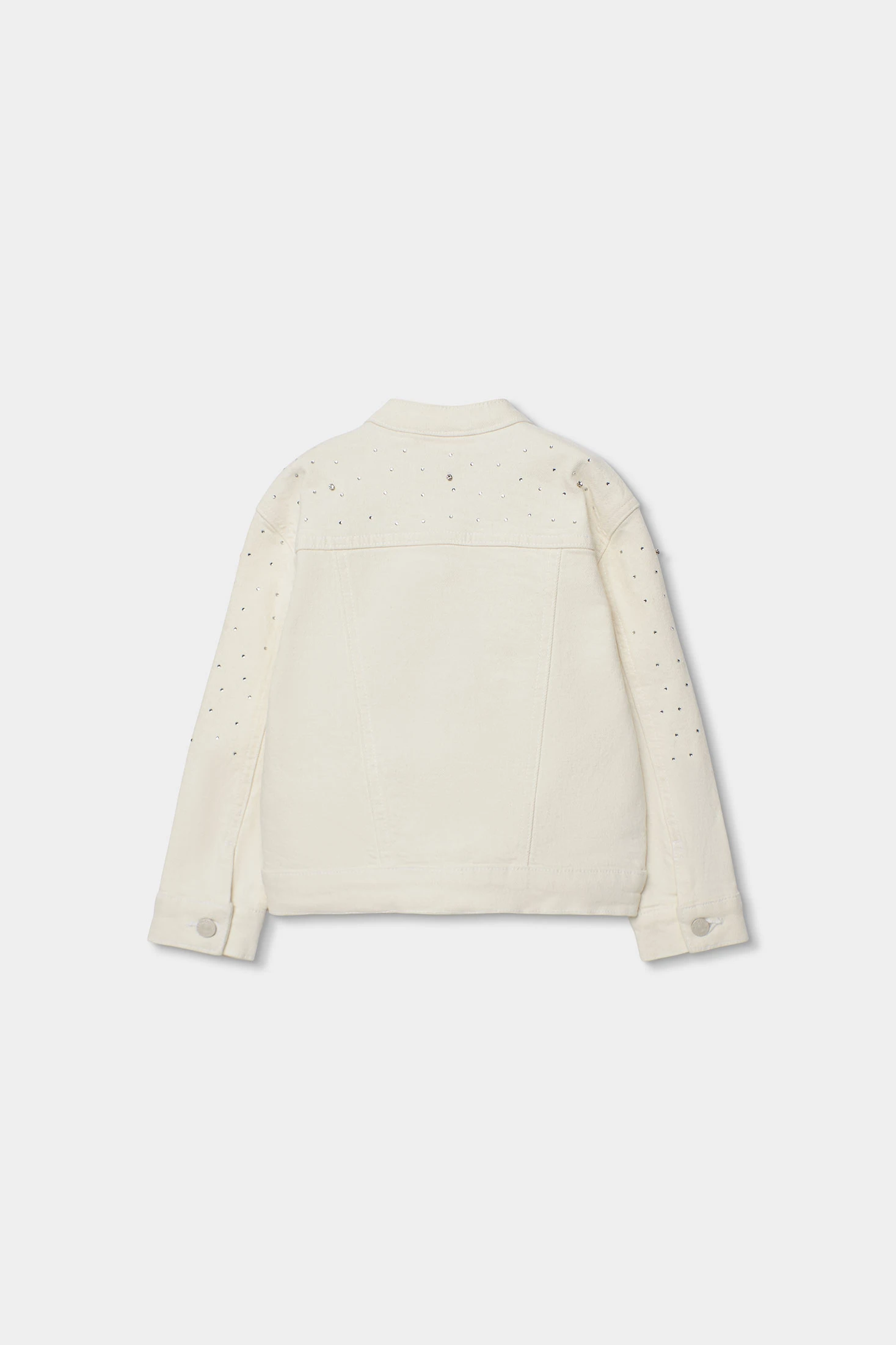 White stretch twill jacket for girls, ideal for in-between seasons. The design includes small decorative rhinestone details in the fabric, adding a touch of elegance. Designed with a round neckline and button fastening, it offers comfort and style. The long sleeves are perfect for the cool weather of early spring or summer nights. Available from ages 2 to 14, it is practical and easy to pair with different outfits. Versatile for both casual occasions and more formal events.