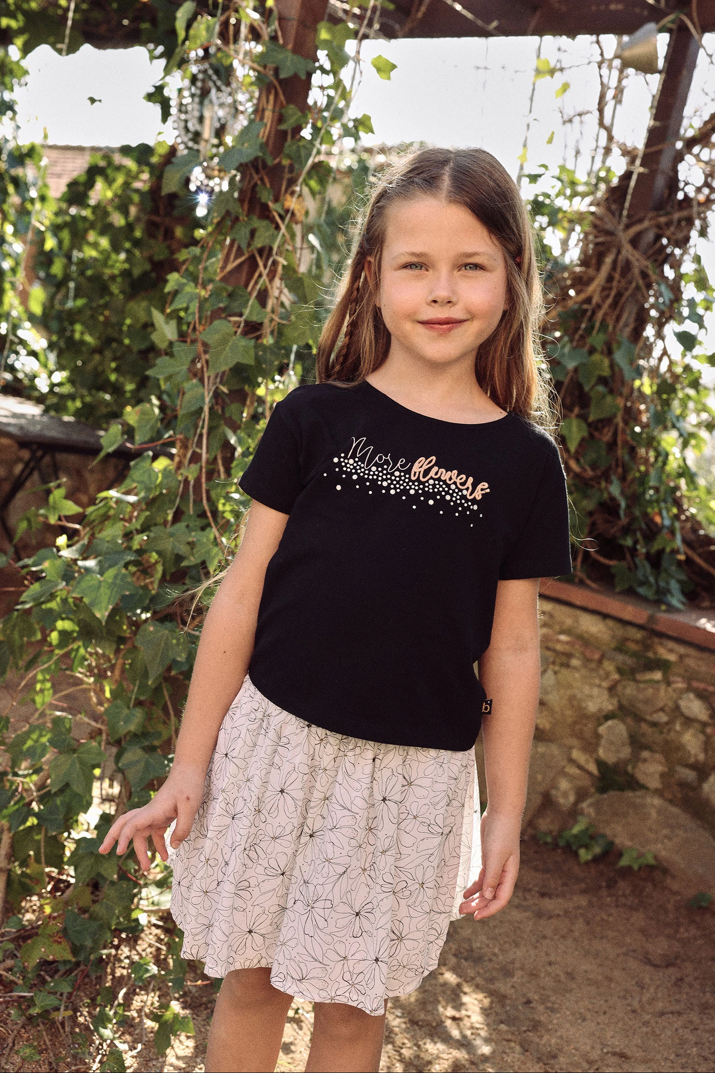 White printed skirt for girls with a delicate floral design in fine strokes and golden details that add an elegant touch. Features a shiny black elastic waistband for a comfortable and practical fit. Its flared cut and lightweight fabric offer movement and freshness. Perfect to combine with basic t-shirts, blouses or knit jackets, creating sophisticated and feminine looks.